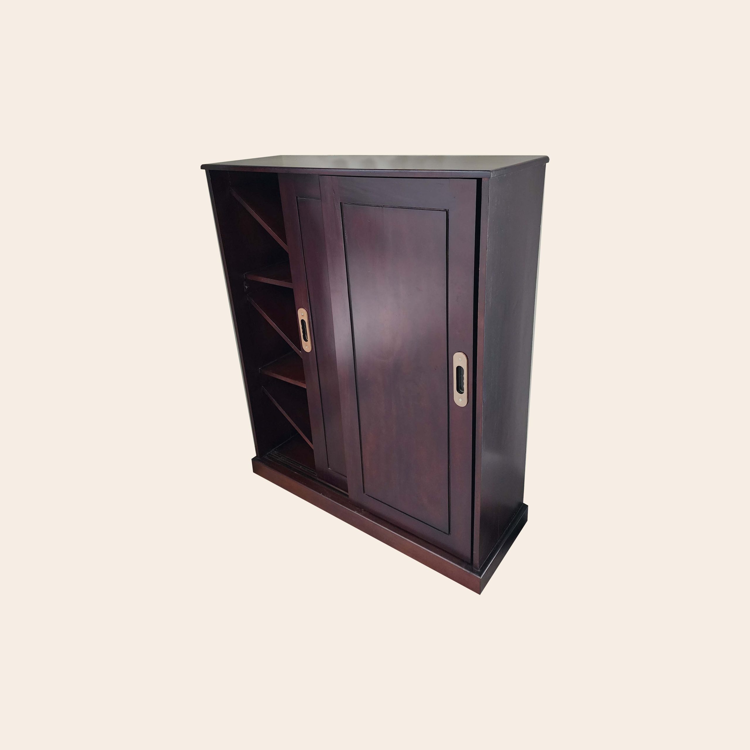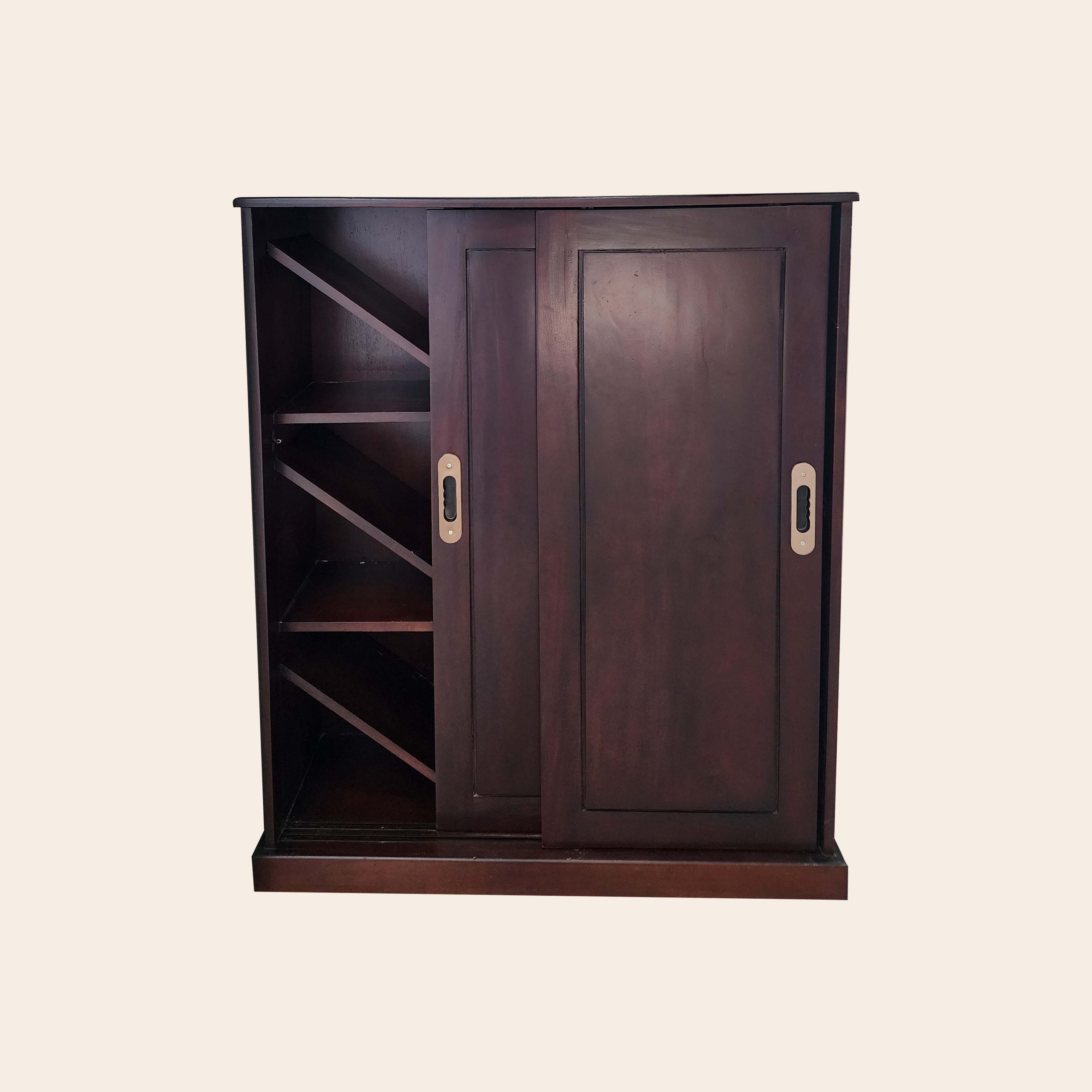 Lemari kayu elegan dengan pintu geser, dilengkapi rak terbuka di sisi kiri untuk penyimpanan tambahan. Cocok untuk menyimpan buku, dekorasi, atau kebutuhan rumah tangga. Terbuat dari kayu solid berwarna cokelat tua yang memberi kesan klasik dan mewah.