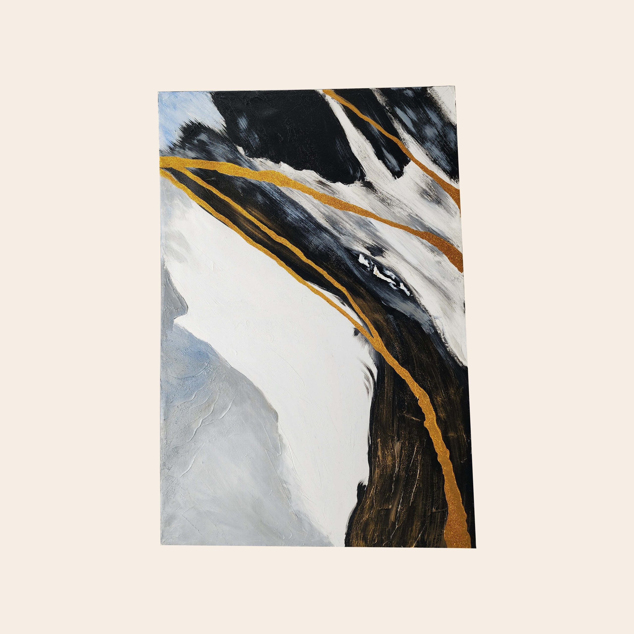 Lukisan abstrak dengan kombinasi warna hitam, putih, dan garis emas, memberi kesan modern dan mewah. Cocok untuk ruang kerja, ruang tamu, atau apartemen.