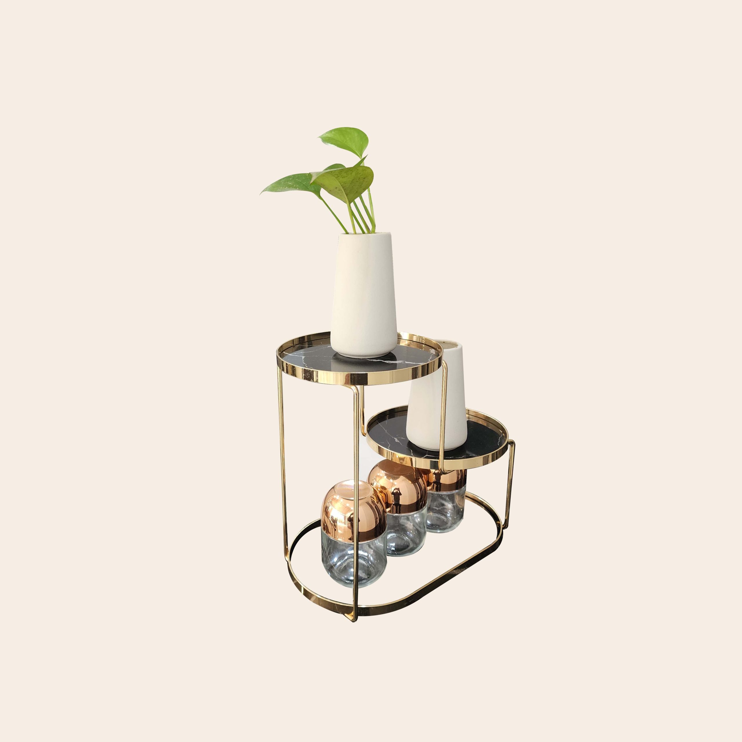 Pot susun dengan rangka emas mengkilap dan alas kaca hitam ini memberikan sentuhan mewah pada ruangan. Cocok untuk menaruh tanaman hias atau vas dekoratif, baik di ruang tamu, ruang kerja, maupun acara pameran. Desain bertingkatnya membuat tampilan lebih dinamis dan modern. Dengan menyewanya, Anda bisa mempercantik ruangan tanpa repot membeli dekorasi baru. Sempurna untuk menambah kesan elegan dan artistik dalam setiap acara.