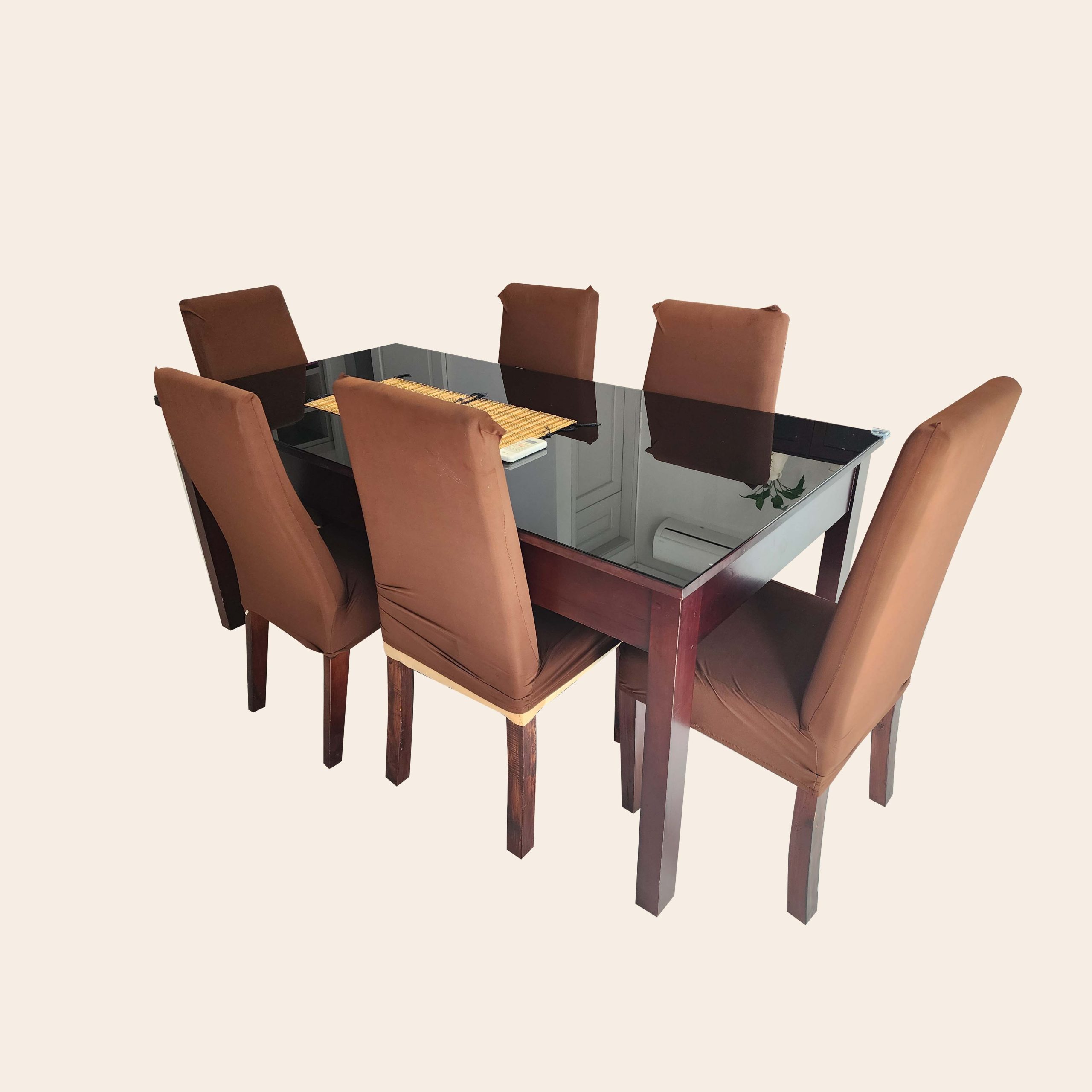 Set meja makan dengan permukaan kaca hitam dan enam kursi berbalut cover coklat ini menghadirkan suasana elegan pada ruang makan. Desainnya modern dengan sentuhan klasik kayu, sangat cocok untuk rumah tinggal, apartemen, maupun acara staging interior. Kursinya nyaman digunakan, sedangkan meja kaca memberikan kesan mewah. Dengan menyewanya, Anda bisa menghadirkan ruang makan berkelas tanpa perlu membeli perabotan baru.