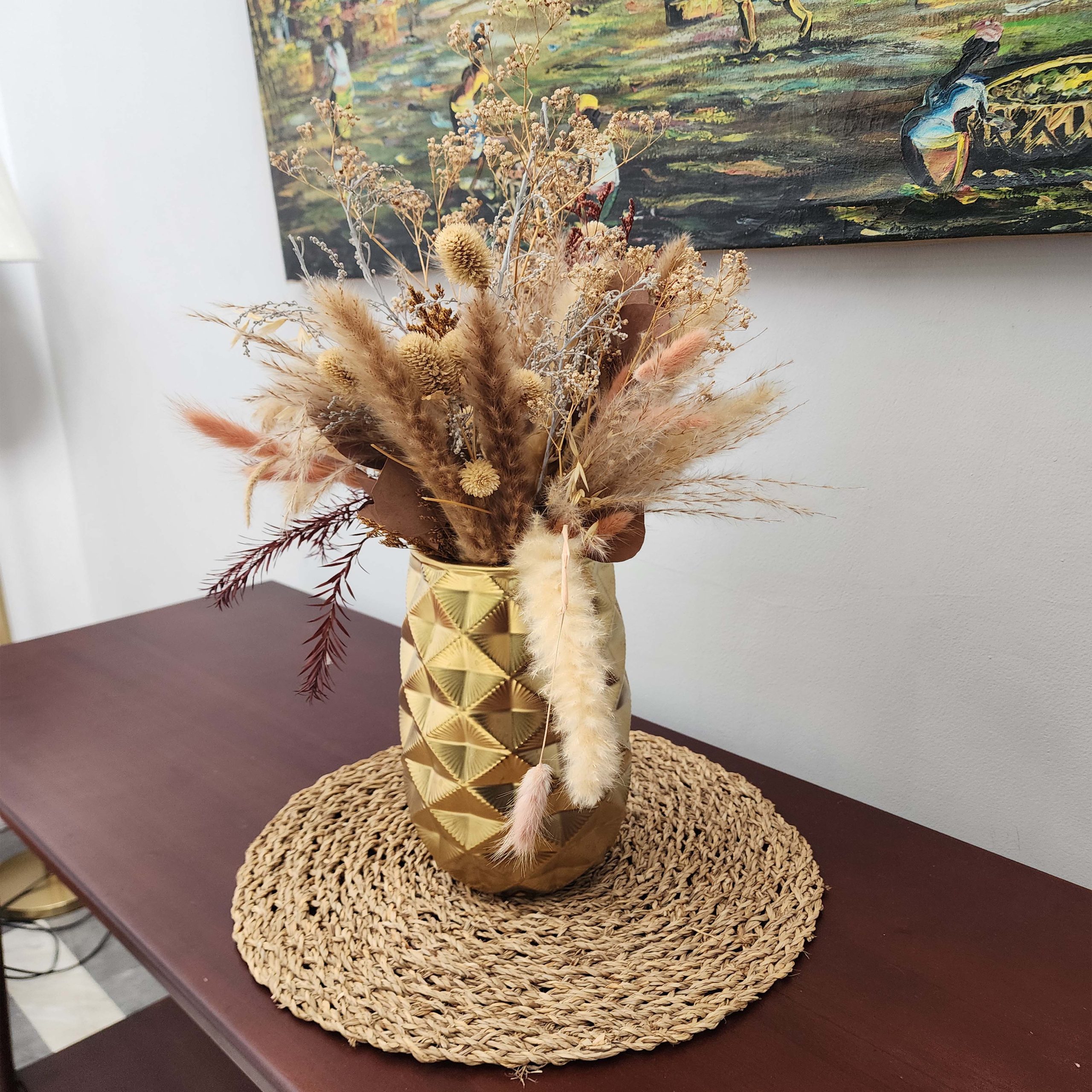 Disewakan vas bunga emas dekoratif per tahun lengkap dengan rangkaian bunga kering. Memberikan nuansa hangat, estetik, dan elegan untuk dekorasi ruang tamu, kamar, maupun area resepsi.